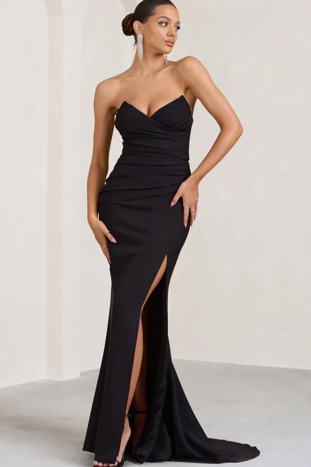Make an impact at any formal occasion whether it be in a ballroom or bar wearing our extravagant maxi dress, Elene. Cut from luxurious black crepe with a touch of stretch to hug your curves, this long black dress boasts a bandeau bodice with delicate pleats that cascade into a floor-sweeping fishtail skirt.Features- Premium stretch crepe- Bandeau neckline- Boned bodice- Asymmetric pleating- Invisible zip closure- Split fishtail skirt- Maxi lengthSizing & FitModel is 5’8″ and wears UK size 8/US size 4Product InformationDesigned exclusively by Club L LondonLined with some stretchPremium crepe in Black (90% Polyester, 10% Elastane)157cm total length