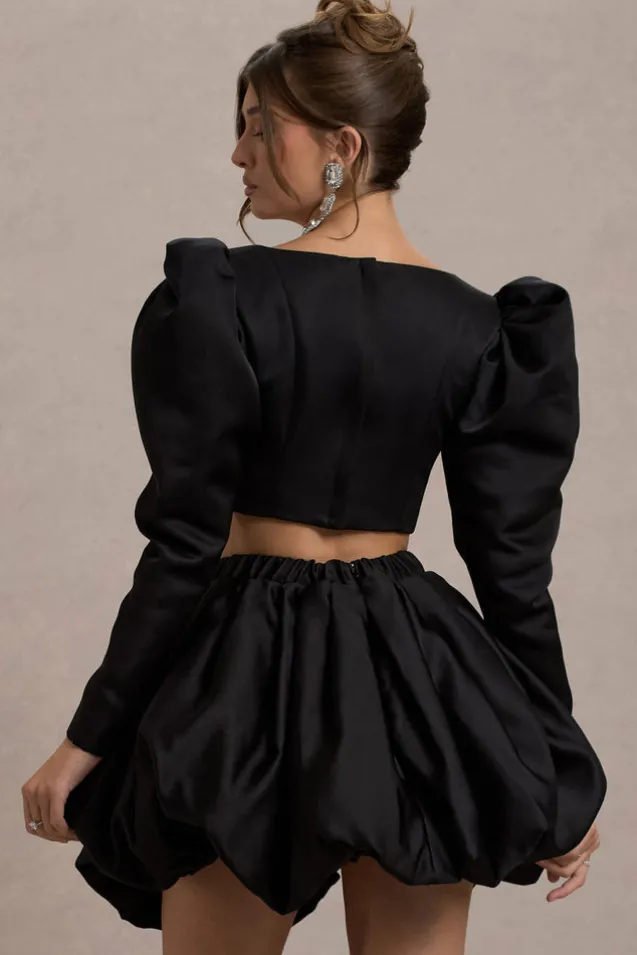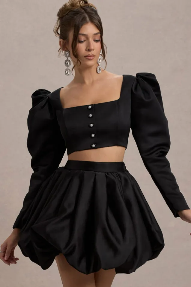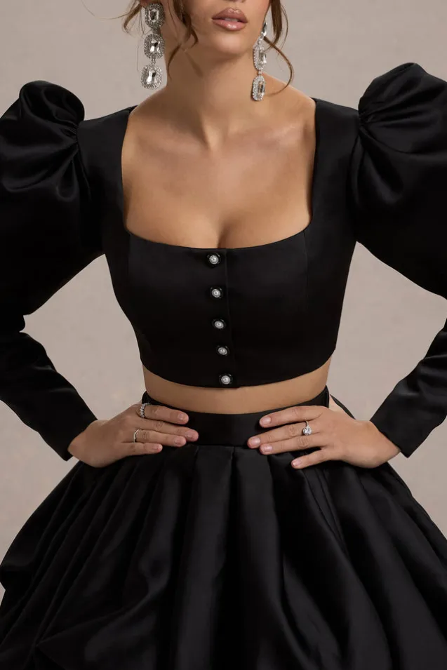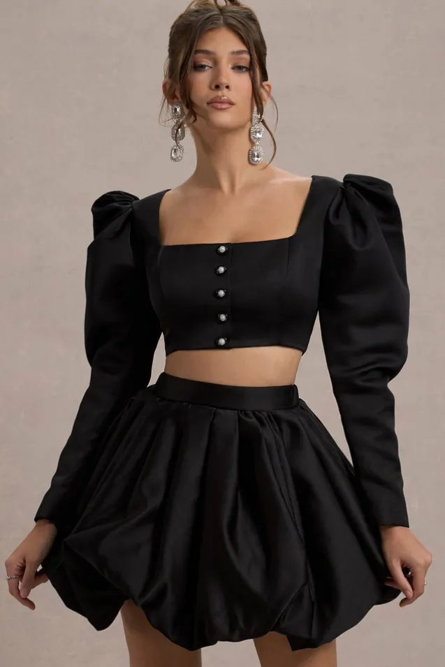 Eloisa | Black Satin Puff-Sleeve Cropped Jacket