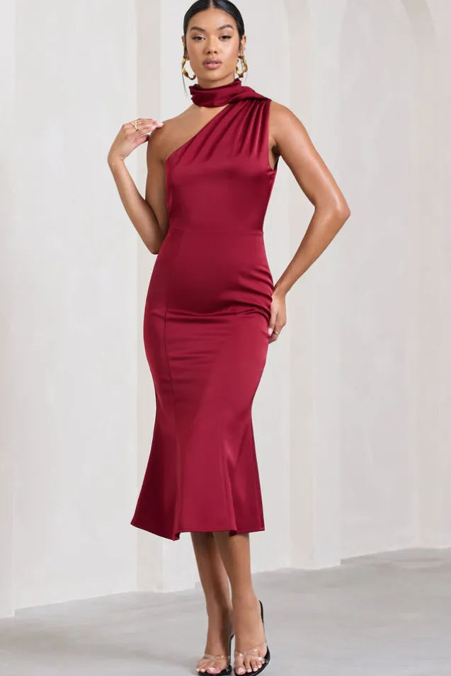 Golden Girl | Burgundy Satin One Shoulder High-Neck Flared Midi Dress