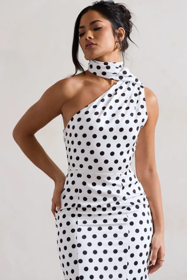 Our newest midi Golden Girl is the perfect pick for any special event. Its delicate draping and white polka dot satin makes it an elegant option for race days, weddings and everything in between. Golden Girl is finished with a soft peplum hem and open-back.Features – Premium stretch satin- Bodycon fit – Asymmetric halter neckline – One shoulder – Draped open back- Peplum hemline- Invisible zip closure- Swanhook closure- Midi length Sizing & Fit Model is 5’6″ and wears UK size 8/US size 4 Product Information Designed exclusively by Club L London Double layered with some stretch Premium heavy satin in White Polka Dot (100% Polyester) 120cm total length