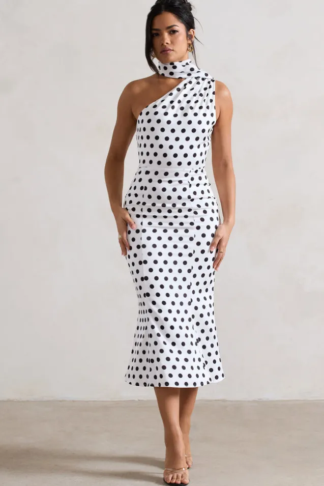 Golden Girl | White Polka Dot One Shoulder High-Neck Flared Midi Dress