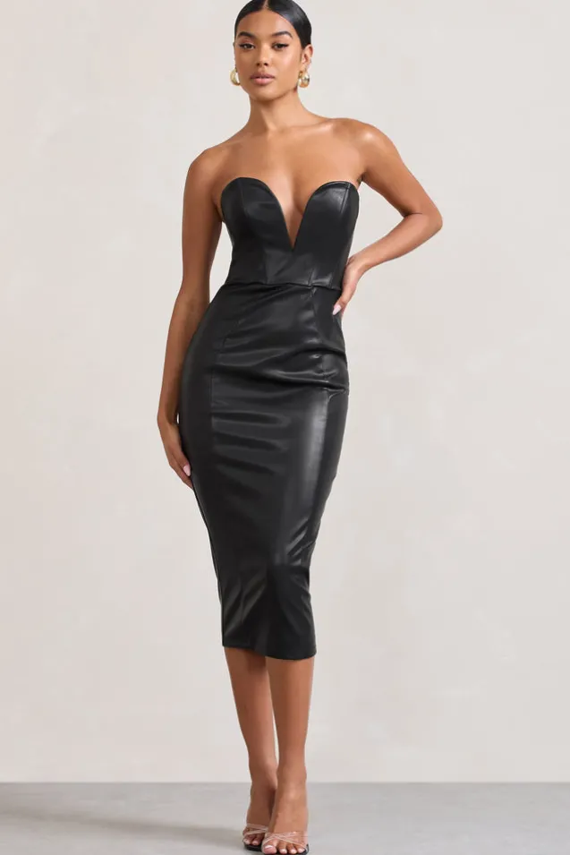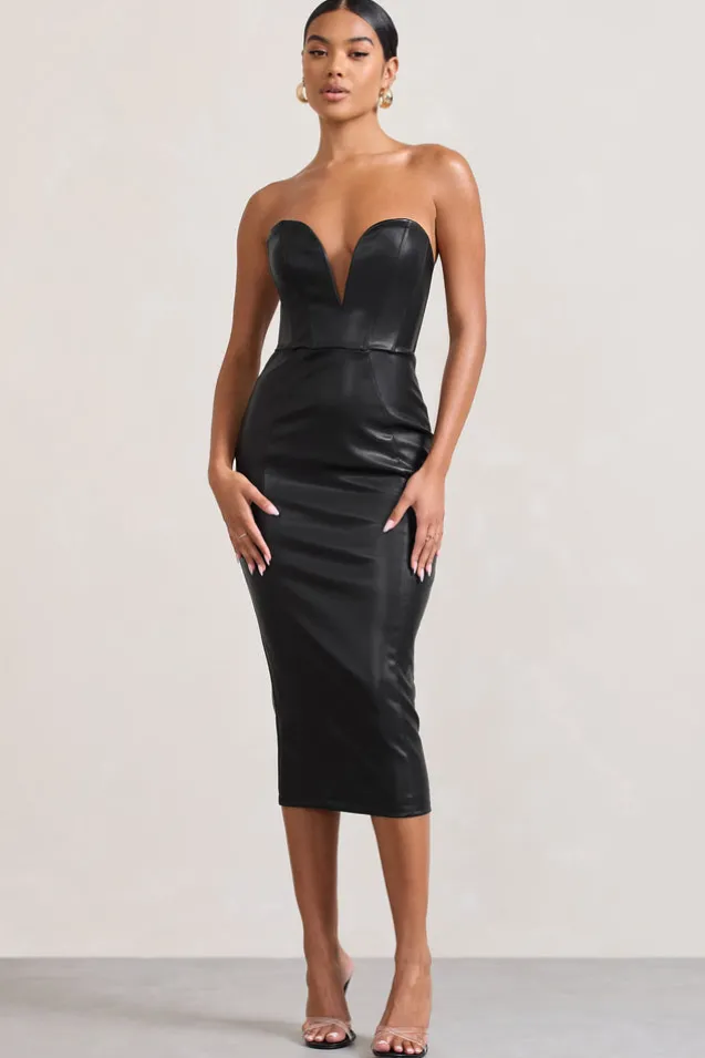 Hailey | Black Faux Leather Strapless Sweetheart Corset Midi Dress