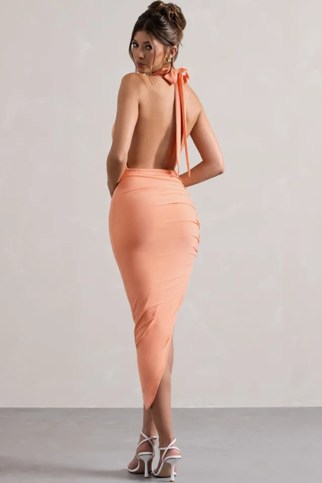 Adorned with artful asymmetry, Hayley has multiple elevated details to fall in love with. Defined by a tantalising open back and cowl neckline, this peach maxi hugs your curves in all the right areas. Compliment its powerful shade by styling yours with subtle gold accents during your next cocktail party. Features – Premium stretch jersey- Cowl neckline – Self-tie halter- Open back- Asymmetric hemline – Maxi length Sizing & Fit Model is 5’7 and wears UK size 8/US size 4Product Information Designed exclusively by Club L London Double layered with good stretch Premium jersey in Peach (95% Polyester, 5% Elastane) 140cm total length
