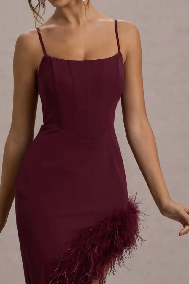 High Status | Burgundy Strappy Corset Asymmetric Maxi Dress With Feather Trim