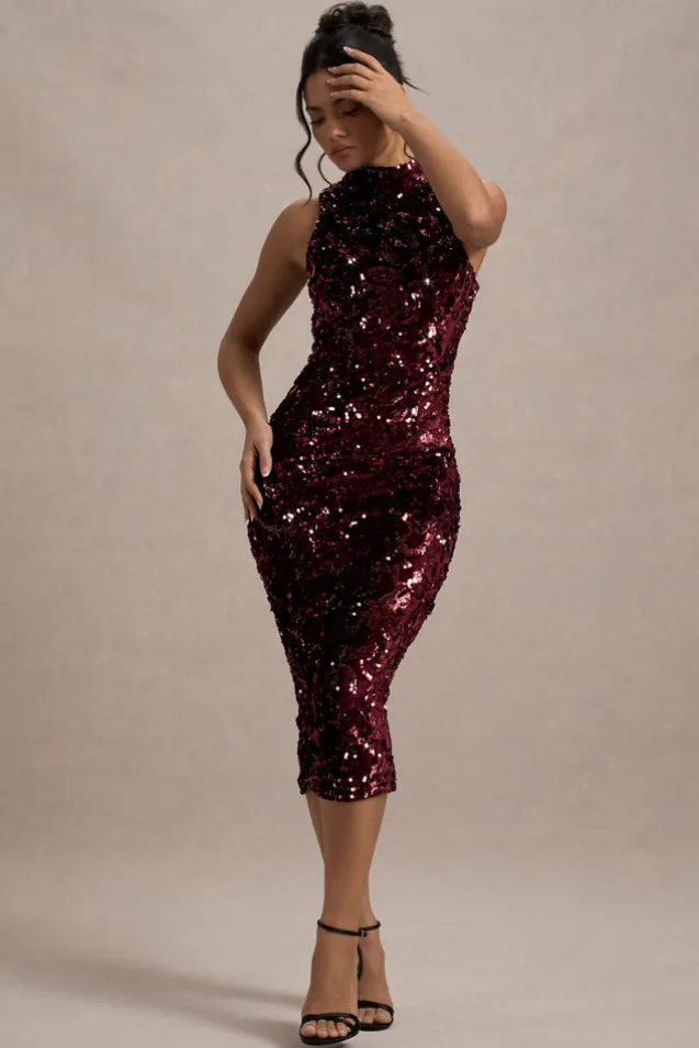 Hypnosis | Berry Sequin Sleeveless High-Neck Midi Dress