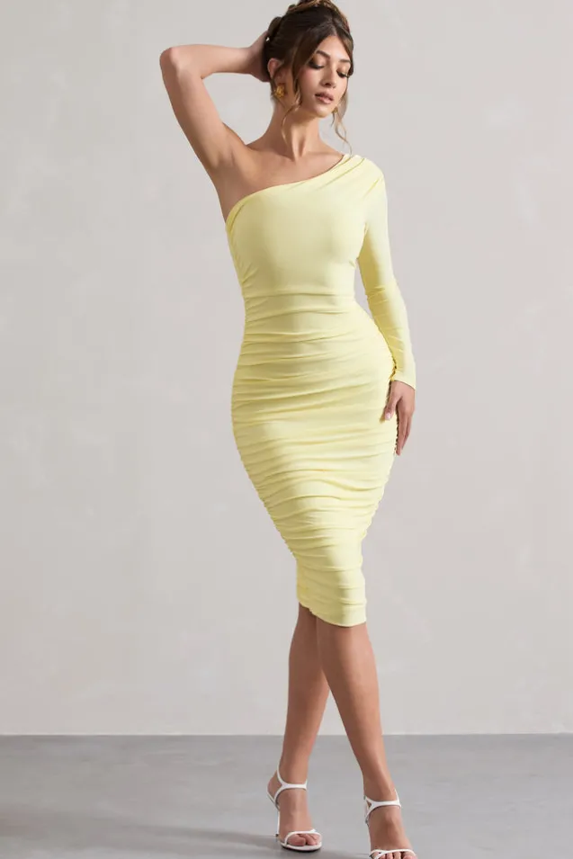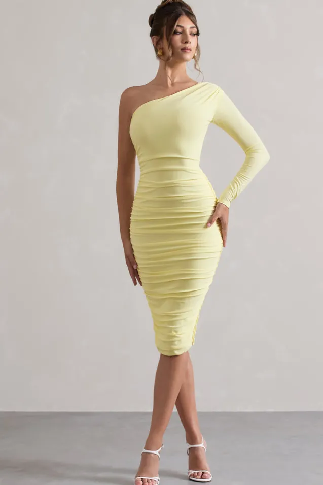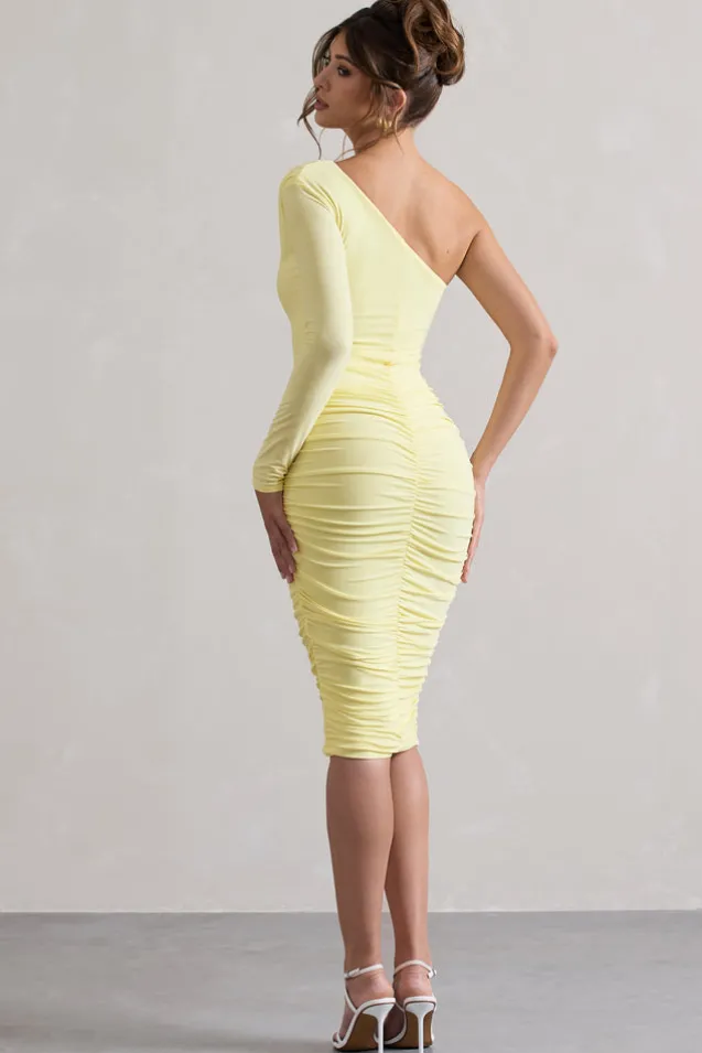 In The Shadows | Yellow One Sleeve Midi Dress With Ruching
