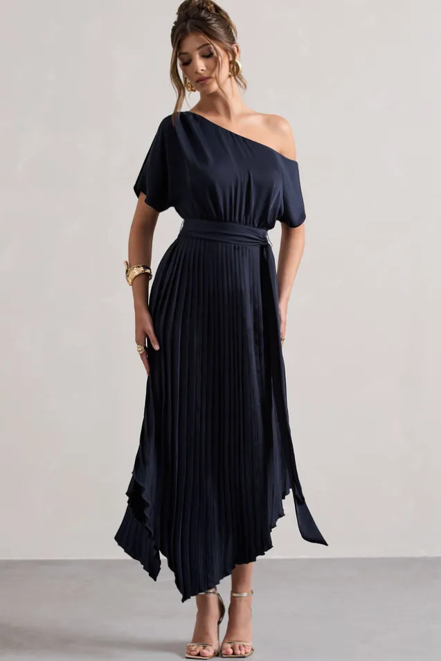 Artful asymmetry and playful pleating come together in India. Crafted in a deep navy shade of a premium flowing satin, this midi dress features an asymmetric neckline and hem. India is detailed with a pleated plisse skirt and self-tie satin belt.Features – Premium satin- Asymmetric neckline – Short sleeves- Button closed keyhole- Self fabric belt- Invisible zip closure- Plisse skirt- Asymmetric hem- Maxi length Sizing & Fit Model is 5’7 and wears UK size 8/US size 4Product Information Designed exclusively by Club L London Unlined with no stretch Premium satin in Navy (100% Polyester) 140cm total length