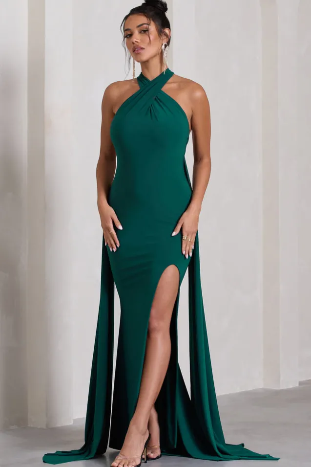 Intertwined | Bottle Green Halter-Neck Open-Back Split Maxi Dress With Scarf Detail