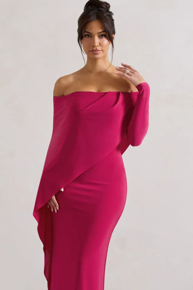 Jana | Dark Pink Bardot Cape Maxi Dress