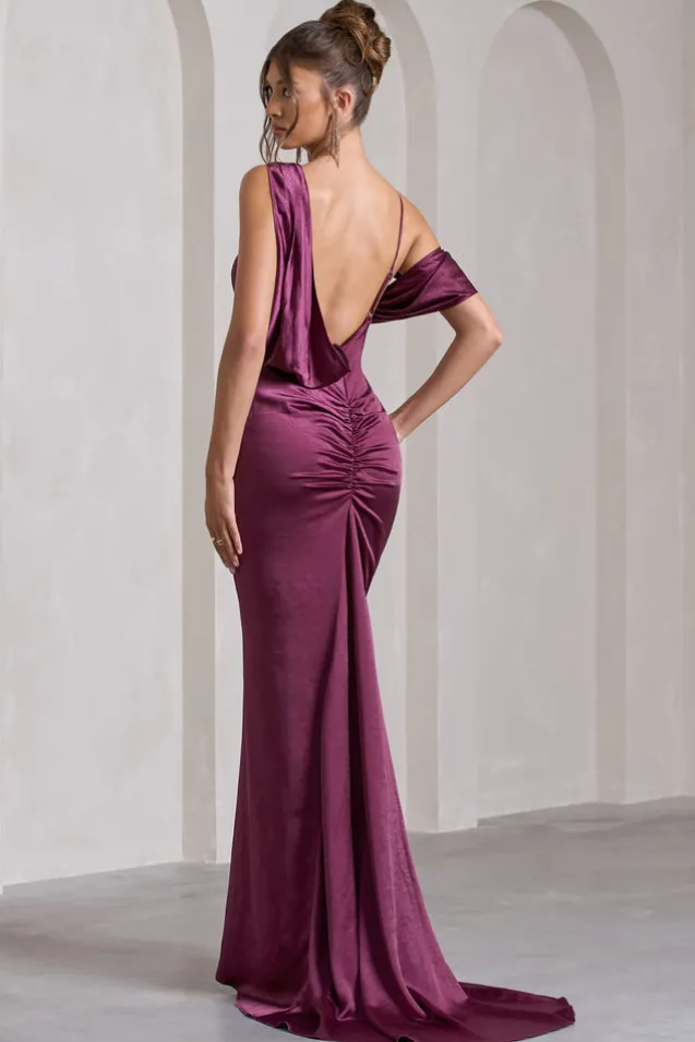 Jayne | Plum Satin Asymmetric Draped Split Maxi Dress