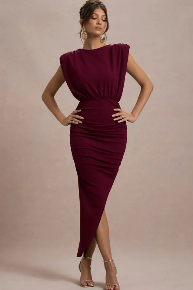 Designed in a timeless, sophisticated silhouette, Jennifer is a stand-out staple. Providing all-day comfort in our signature stretch crepe, this port maxi features a gathered waistline, shoulder padding and asymmetric hem for a flattering fit. For an elevated evening ensemble, try pairing yours with our Joseline gold earrings.Features – Premium stretch crepe- Shoulder padding- Button-closed collar- Keyhole cut-out- Invisible zip closure – Ruched skirt- Asymmetric hemline- Maxi length Sizing & Fit Model is 5’7 and wears UK size 8/US size 4Product Information Designed exclusively by Club L London Double layered with good stretch Premium crepe in Port (95% Polyester, 5% Elastane) 140cm total length