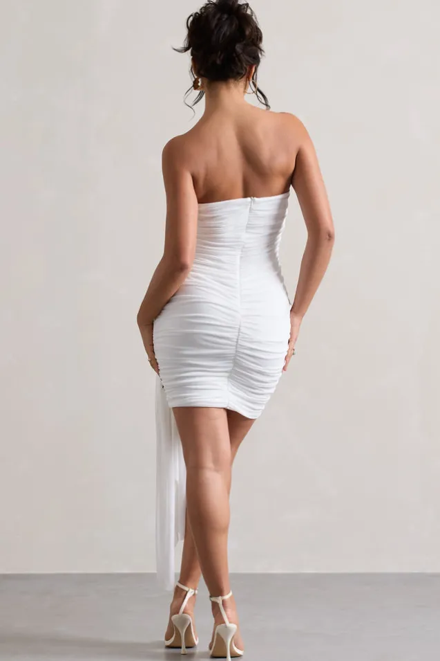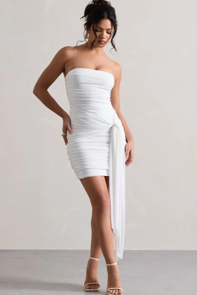 Looking for a must-have mini? Jesse is the one to beat. Arriving in a staple white shade of our premium jersey with a fully ruched bodice to flatter your figure, Jesse is defined by a knot detail that perfectly cinches your waist. Style yours with a tousled bun to show off its bandeau neckline for the perfect night out look.Features – Premium stretch jersey- Bodycon fit- Fully ruched- Bandeau neckline – Strapless – Knot detail- Invisible zip closure- Mini length Sizing & Fit Model is 5’6 and wears UK size 8/US size 4Product Information Designed exclusively by Club L London Double layered with good stretchPremium jersey in White (95% Polyester, 5% Elastane) 85cm total length