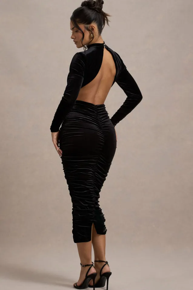 Joanna | Black Velvet High-Neck Backless Midi Dress