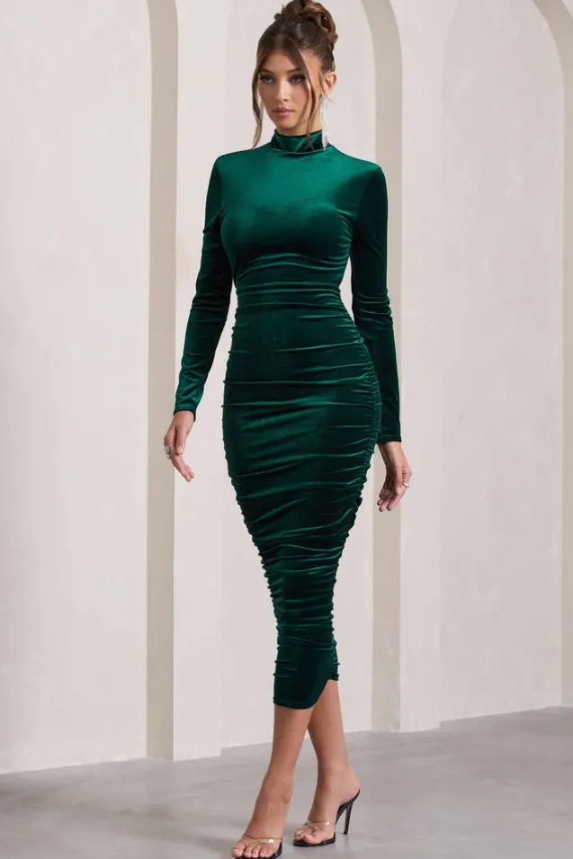 Joanna | Bottle Green Velvet High-Neck Backless Midi Dress