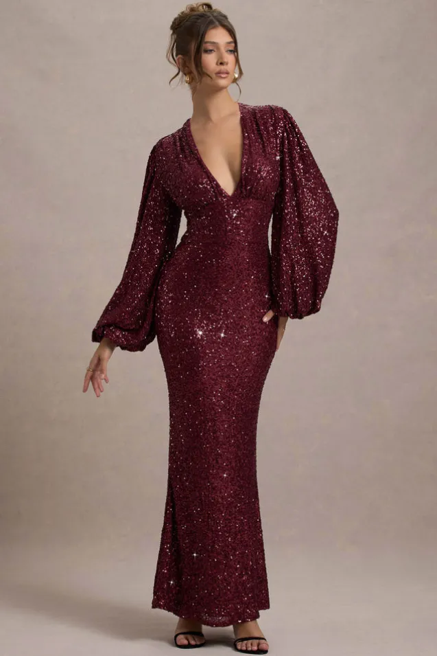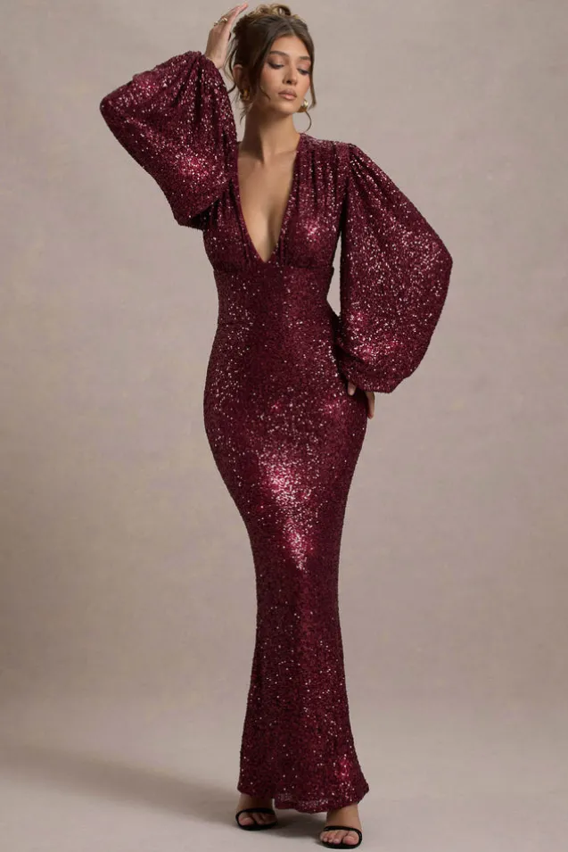 Kaelin | Berry Sequin Plunge-Neck Maxi Dress