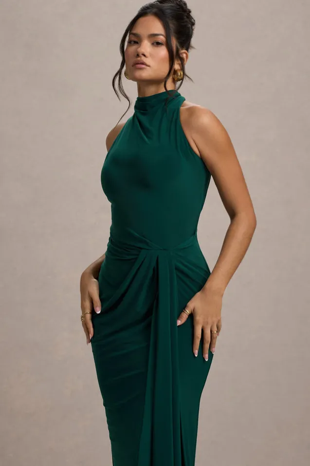 Khari | Bottle Green High-Neck Twisted Maxi Dress With Drape