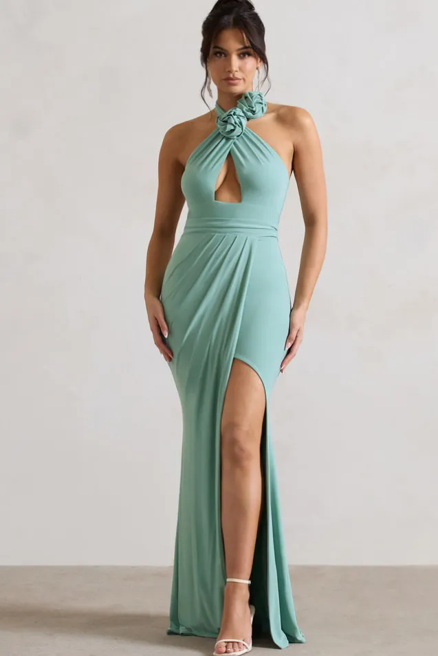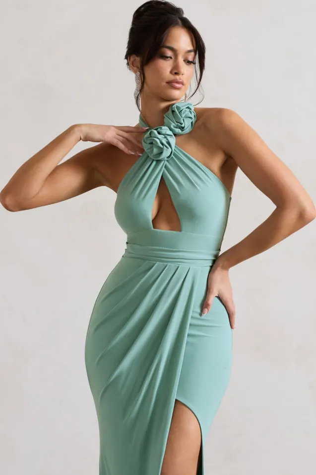 Kira | Sage Halter-Neck Cut-Out Split Maxi Dress With Flowers