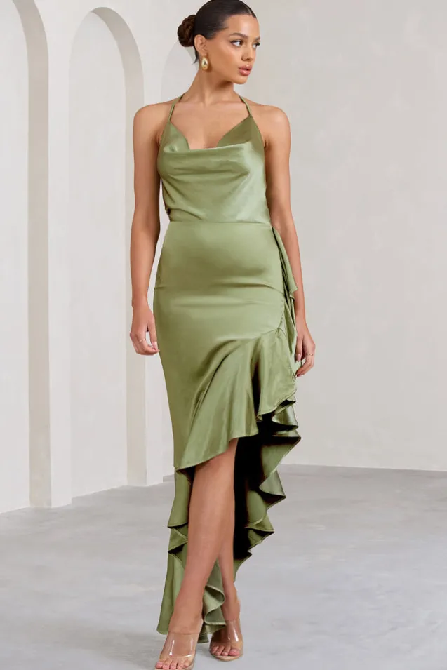 As stunning as the film star that inspired its name, Lady Rosselini comes artfully crafted in a weighted olive satin to let your silhouette shine. This long silky dress features a draped cowl neckline and two sets of lace straps that tie at the neck and across your open back. Finished with voluminous ruffles, this asymmetric maxi dress would be perfect for special occasions in the warm months ahead.Features- Premium heavy satin- Draped cowl neckline- Self-tie cami straps- Open back- Invisible zip closure- Asymmetric hemline- Ruffle trim- Maxi lengthSizing & Fit Model is 5’8 and wears UK size 8/US size 4Product InformationDesigned exclusively by Club L LondonUnlined with no stretchPremium heavy satin in Olive Green (100% Polyester)150cm length