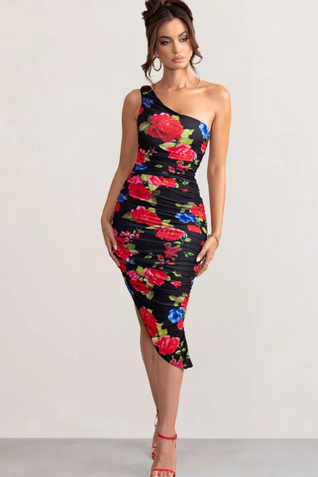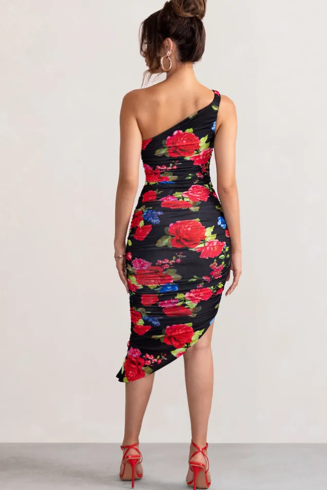 Late Night | Black Floral Print Asymmetric One Shoulder Ruched Midi Dress
