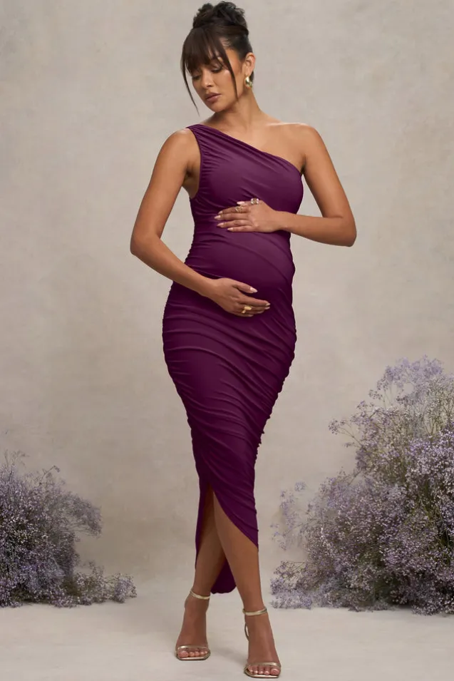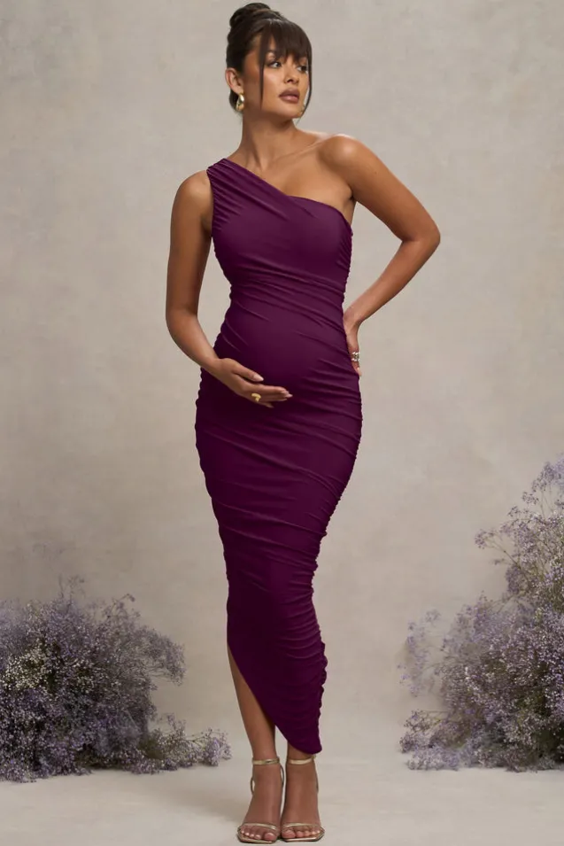Late Night | Plum Maternity Ruched One Shoulder Midi Dress