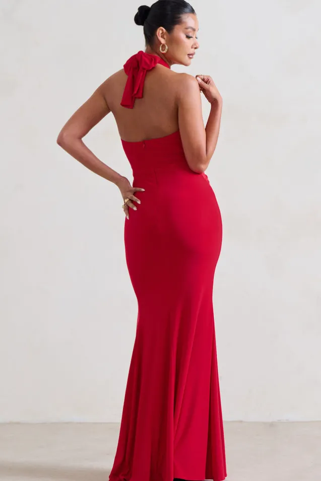 Luxurious in both name and design, this red maxi dress will make you something to behold. Luxuria arrives in our signature stretch jersey with a halter neckline that twists and ties into a bow from behind. Also twisted at the waist and finished with a split floor-length skirt, there’s no red dress better suited to any and every special event.Features- Premium stretch jersey- Crossed halter neckline- Self-tie straps- Cut-out bodice- Open back- Invisible zip closure- Twisted waist detail- Split hemline- Maxi lengthSizing & FitModel is 5’8″ and wears UK size 8/US size 4Product InformationDesigned exclusively by Club L LondonDouble layered with excellent stretchPremium jersey in Red (95% Polyester, 5% Elastane)157cm total length
