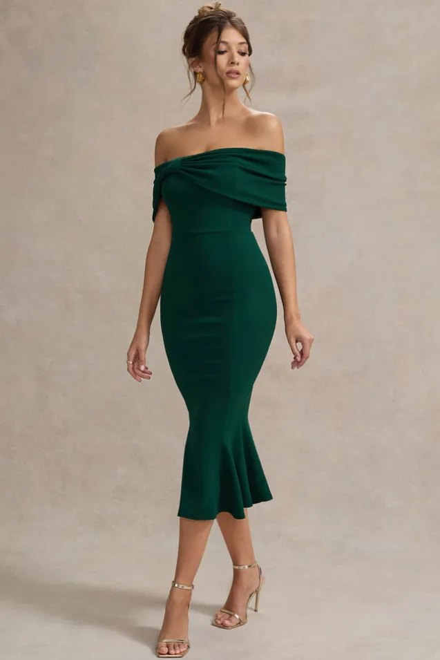 Lydia | Bottle Green Bardot Bow Detail Midi Dress