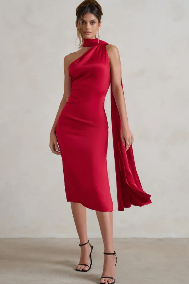 Madame | Berry Red Satin Asymmetric Scarf Neck Backless Midi Dress