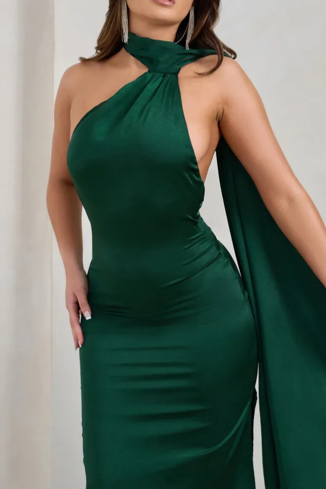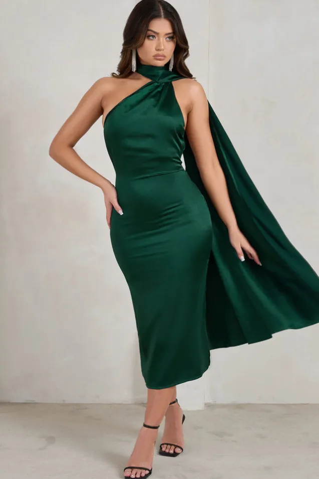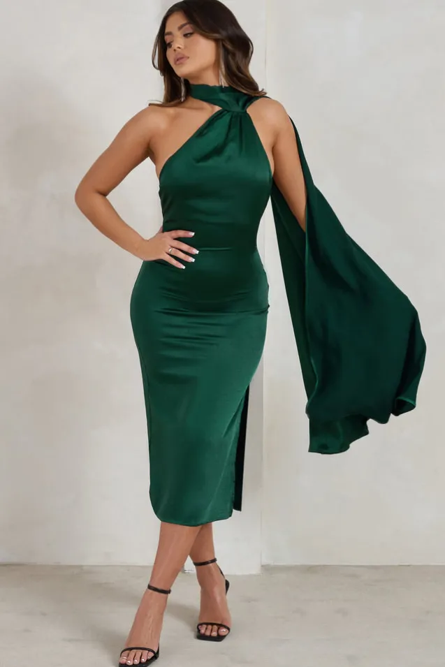 Madame | Bottle Green Satin Asymmetric Scarf Neck Backless Midi Dress