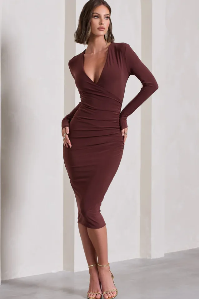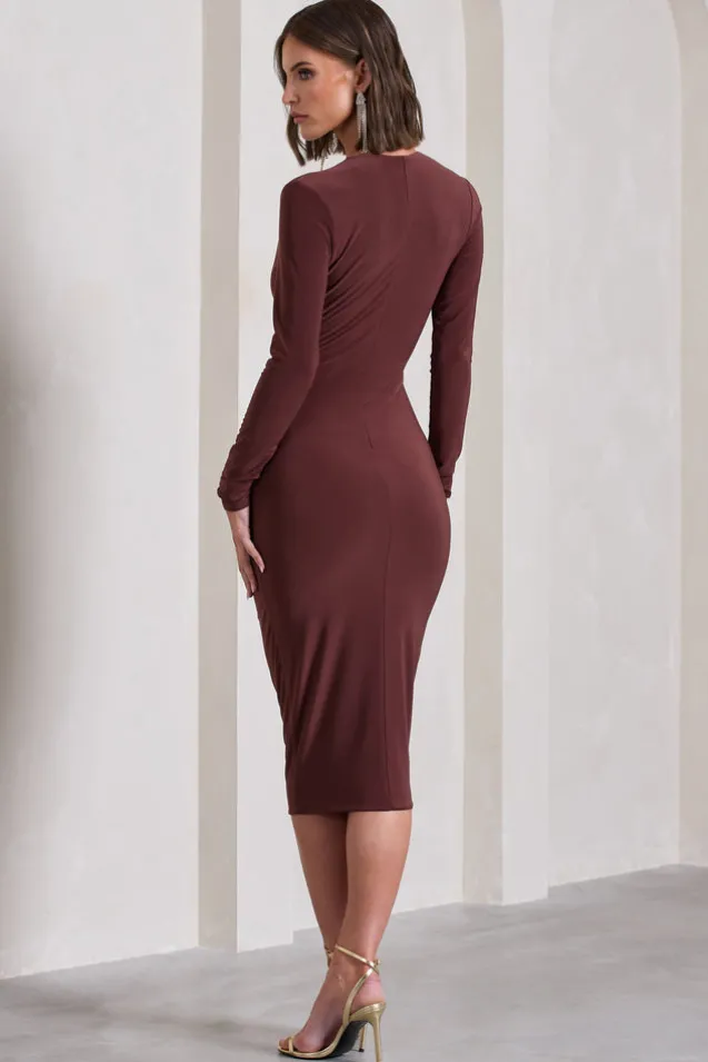 Marcia | Chocolate Brown Bodycon Plunge-Neck Midi Dress