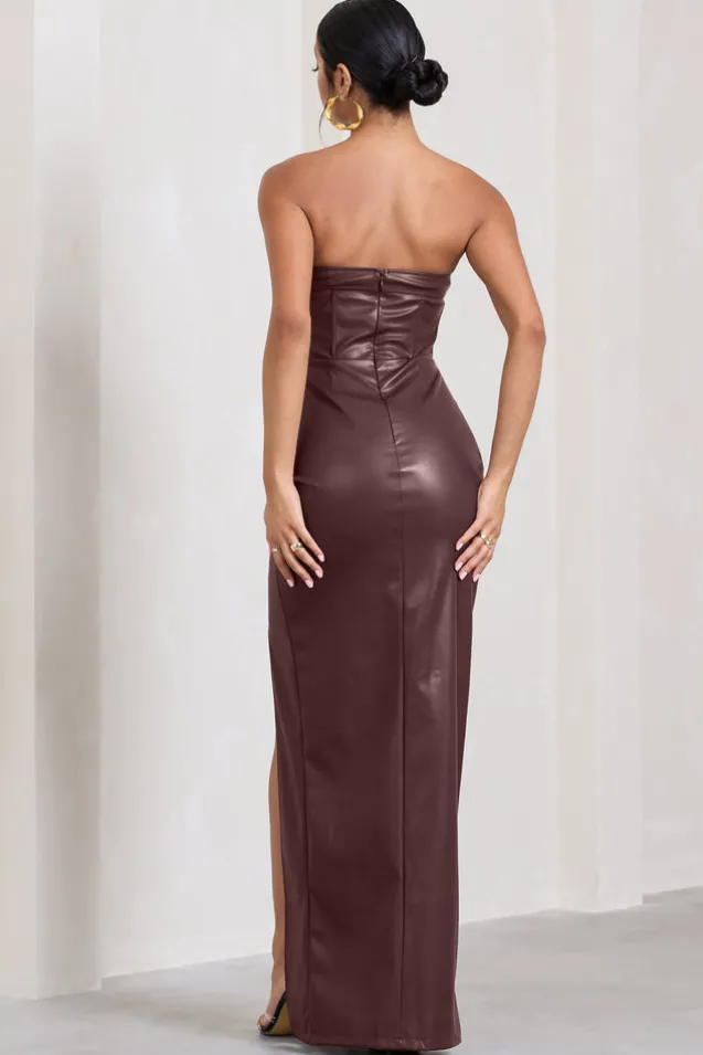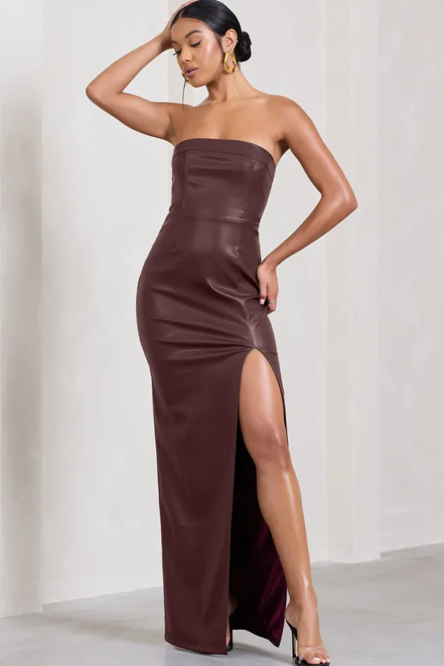 Marlene | Burgundy Faux Leather Strapless Bandeau Split Maxi Dress
