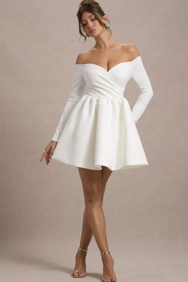 Make your mark in in our latest mini Marta. Designed in a premium scuba crepe that gives this white mini dress its structured skater skirt, Marta boasts an elegant bardot neckline and flattering wrap bodice. For the Ultimate garden party look style this mini with some strappy stilettoes. Features – Premium scuba crepe- Bardot neckline- Long sleeves – Wrap bodice- Invisible zip closure – Skater skirt- Mini length Sizing & Fit Model is 5’7 and wears UK size 8/US size 4Product Information Designed exclusively by Club L London Fully lined with good stretch Premium scuba crepe in White (95% Polyester, 5% Elastane) 85cm total length