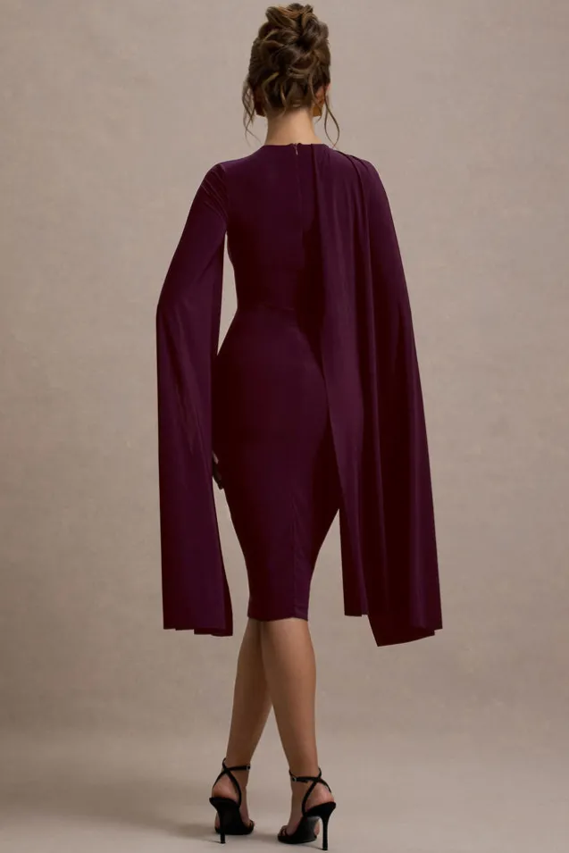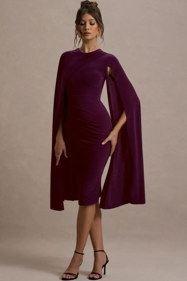 Add some impact to your occasion wardrobe with our unforgettable plum midi dress. Designed to show off your silhouette, this dress has a bodycon fit and is double lined to flatter and enhance. The high neckline is balanced with a below the knee hemline, while the cape sleeves deliver a high impact yet sophisticated look. Perfect for a christening or for a modern wedding guest look, Marysol is the one!Features- Midi dress- Cape sleeve- High neckline- Double lined- Invisible zip fastening- Premium jersey fabricSizing & FitModel is 5’8 and wears UK size 8/US size 4Product InformationDesigned exclusively by Club L LondonFully lined ultra-stretchJersey fabric (95% Polyester 5% Elastane)