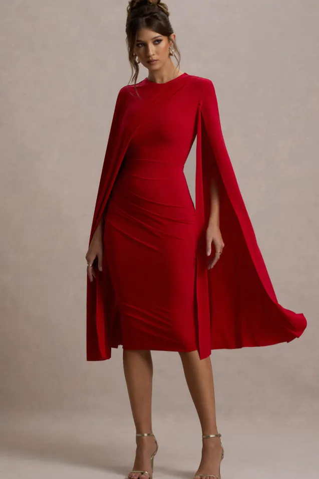 Add some impact to your occasion wardrobe with our unforgettable red midi dress. Designed to show off your silhouette, this dress has a bodycon fit and is double lined to flatter and enhance. The high neckline is balanced with a below the knee hemline, while the cape sleeves deliver a high impact yet sophisticated look. Perfect for a christening or for a modern wedding guest look, Marysol is the one!Features- Midi dress- Cape sleeve- High neckline- Double lined- Invisible zip fastening- Premium jersey fabricSizing & FitModel is 5’8″ and wears UK size 8/US size 4Product InformationDesigned exclusively by Club L LondonFully lined ultra-stretchJersey fabric (95% Polyester 5% Elastane)
