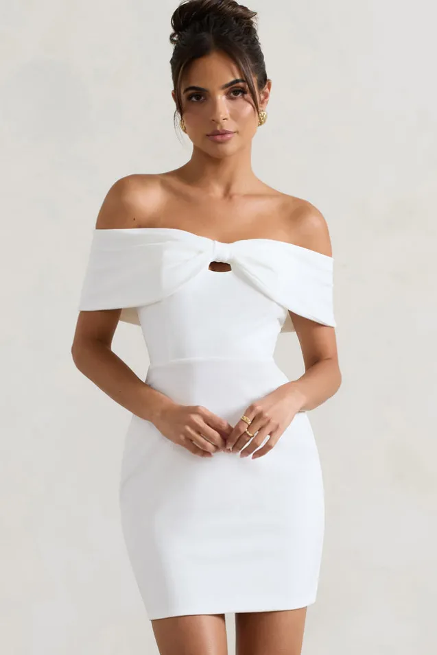 Elevate your date night wardrobe with a mini like Megan. Crafted in our signature scuba crepe to fit you like a glove, this white dress showcases a feminine bow bardot thats highlighted by a chest cut out. A stand out staple, style yours with some gold stilettos like Crossed Wires for an elevated evening look. Features – Premium scuba crepe- Bodycon fit – Bow bardot neckline – Invisible grip tape- Invisible zip closure- Mini length Sizing & Fit Model is 5’6.5″ and wears UK size 8/US size 4 Product Information Designed exclusively by Club L London Fully lined with good stretch Premium scuba crepe in White (95% Polyester, 5% Elastane) 85cm total length
