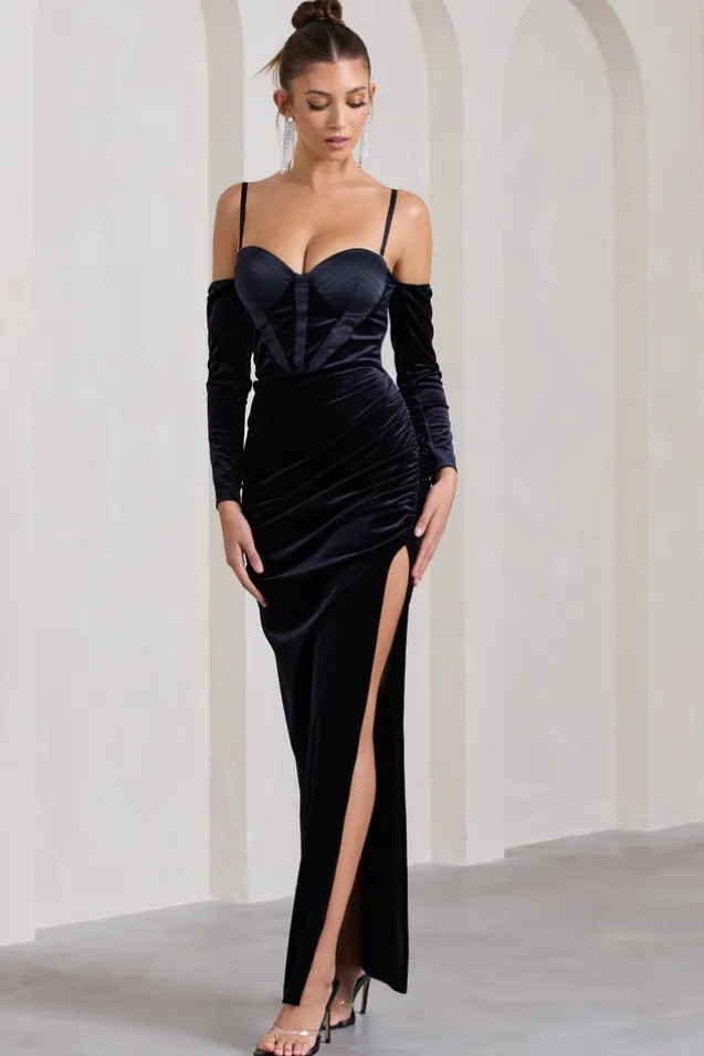 Meribel | Navy Velvet u0026 Satin Long-Sleeved Corset Maxi Dress