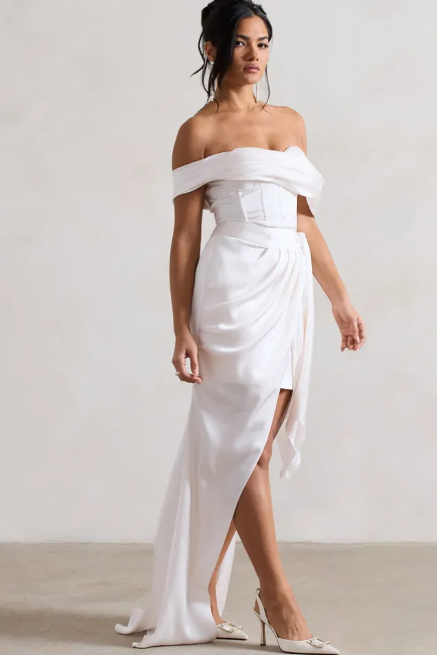 Milano | Cream Satin Bardot Maxi Dress With Detachable Skirt