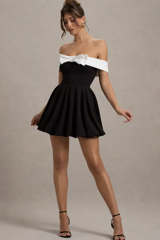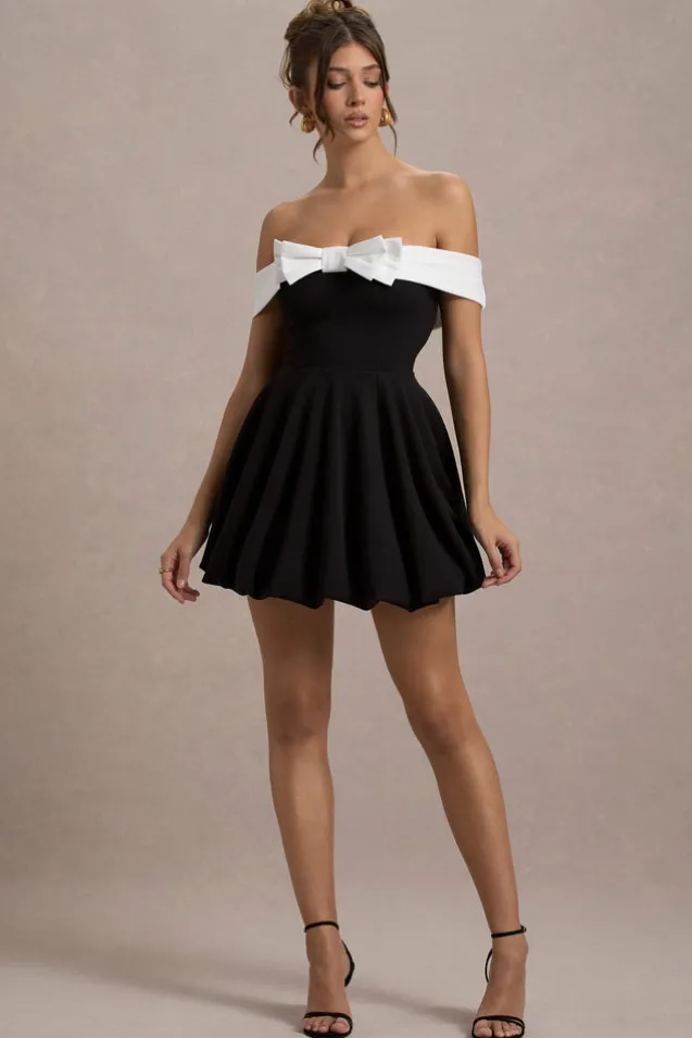 Minimoiselle | Black u0026 White Bow Bardot Mini Dress With Puff-Ball Skirt