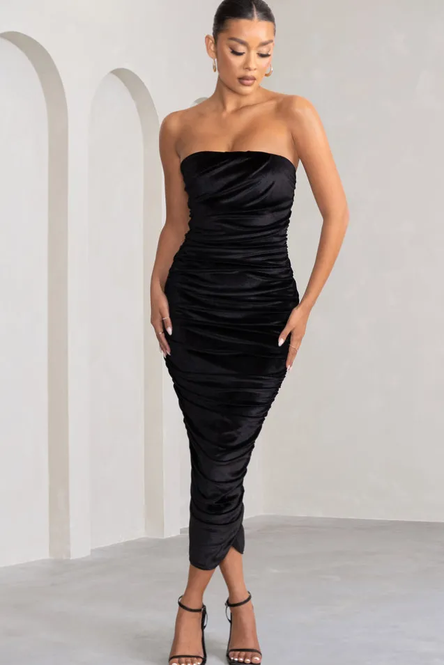 A chic strapless silhouette defines our latest showstopper, My Lady. Designed in a premium black velvet that’s fully ruched to enhance every curve, this sophisticated maxi dress features invisible grip tape to keep the bandeau bodice perfectly in place. We picture My Lady styled for the races but this scene-stealer would turn heads at any special occasion you have upcoming.Features- Premium velvet fabric- Fully ruched- Strapless silhouette- Bandeau neckline- Invisible grip tape- Maxi lengthSizing & FitModel is 5’8″ and wears UK size 8/US size 4Product InformationDesigned exclusively at Club L LondonLined with good stretchPremium velvet fabric in Black (95% Polyester, 5% Elastane)110cm total length