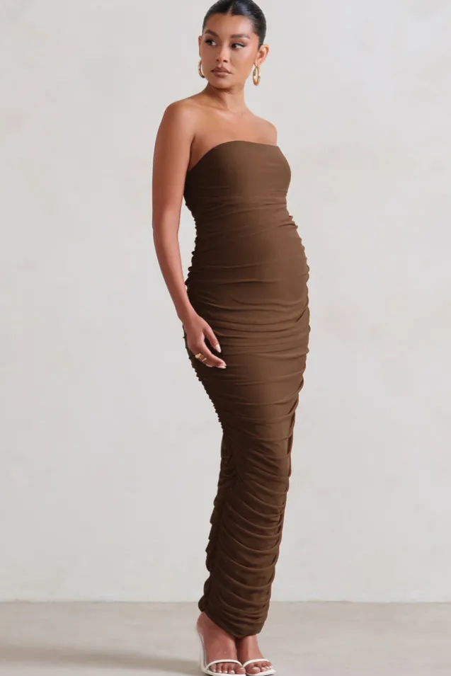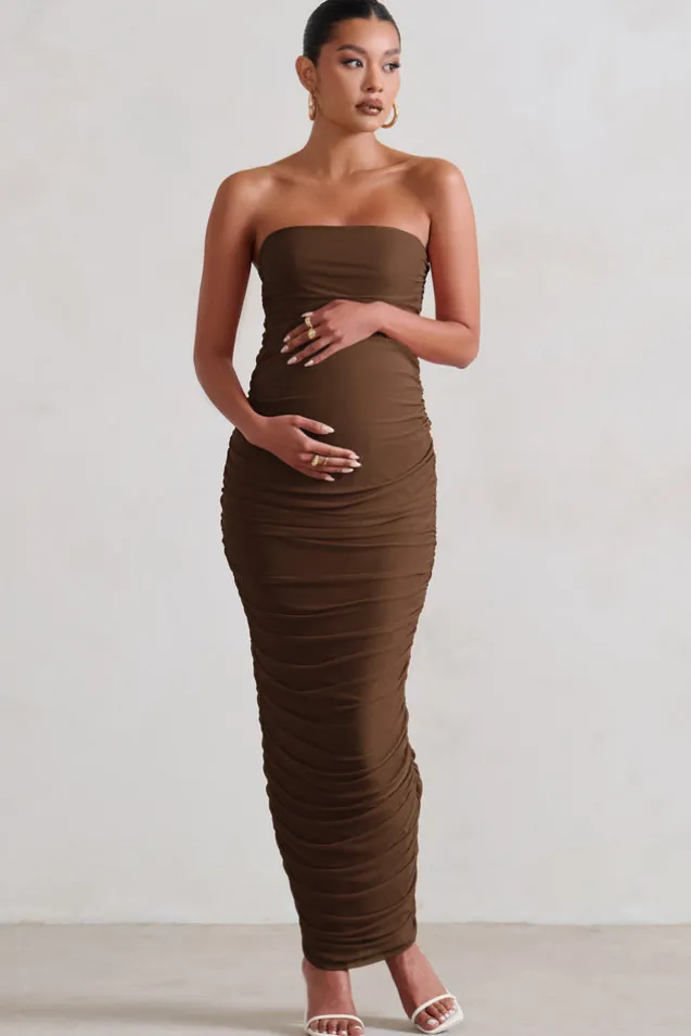 My Lady | Chocolate Maternity Brown Strapless Bodycon Ruched Mesh Maxi Dress