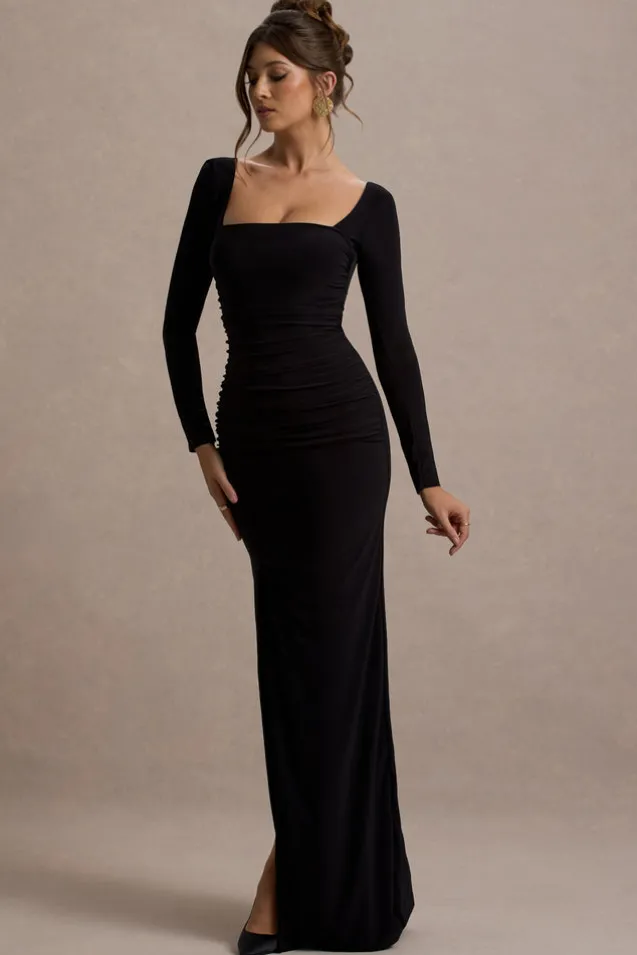 My Pleasure | Black Square Neck Ruched Maxi Dress