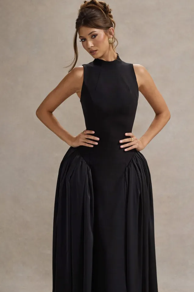 Napoli | Black High-Neck Volume-Skirt Midi Dress