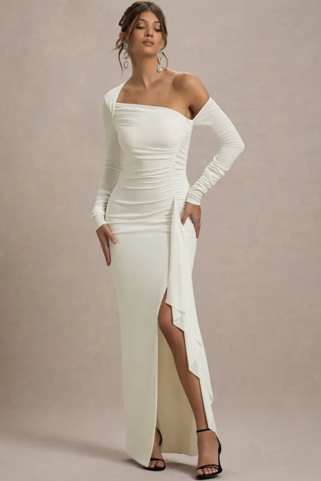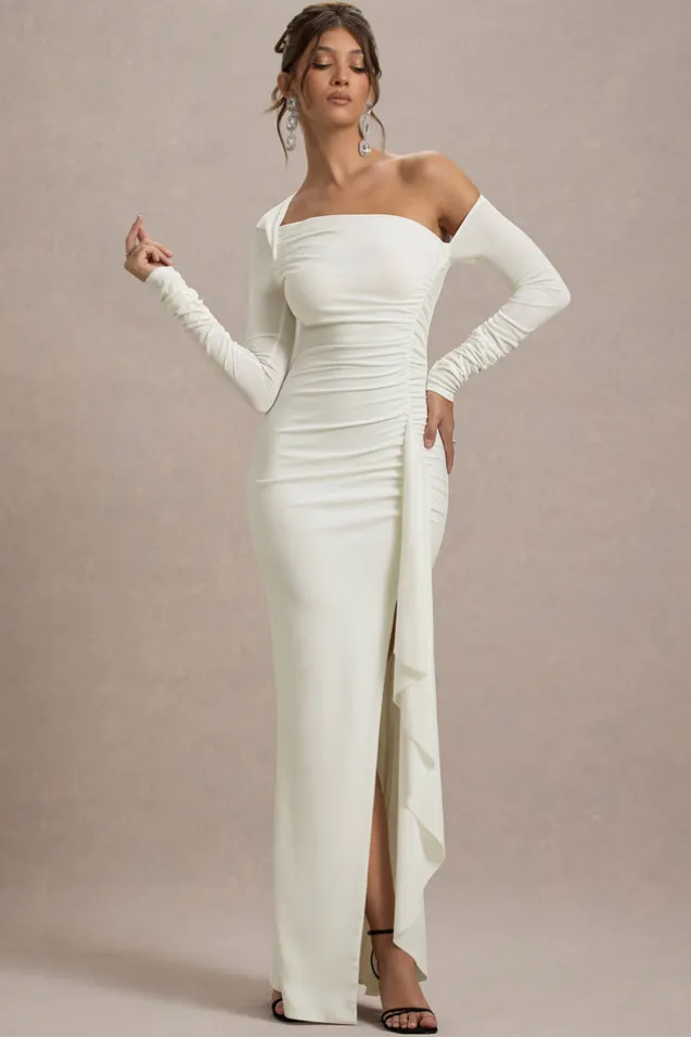 Nerina | Cream Asymmetric Long-Sleeve Split Maxi Dress