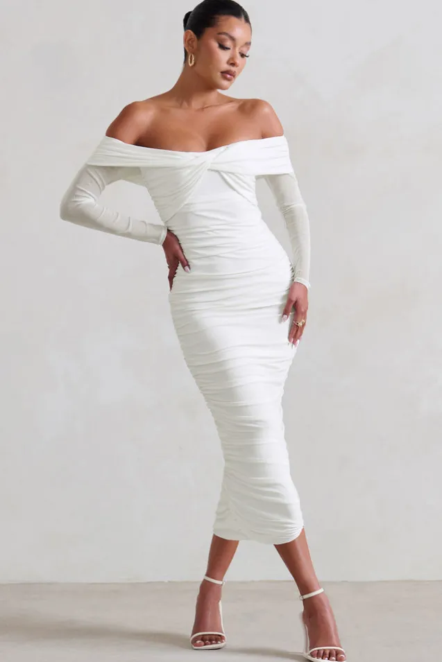 A fine layer of soft white mesh adds a delicate touch to our darling Neva dress. Crafted from a luxurious double-lined jersey with plenty stretch to sculpt your silhouette, this midi dress boasts a twisted Bardot neckline, long sheer sleeves and ruching throughout. Pair our Neva with classic gold hoops for the prefect party ensemble.Features – Premium stretch jersey and mesh- Fully ruched- Twisted Bardot neckline- Long sheer sleeves- Invisible zip closure- Split hem- Midi lengthSizing & Fit Model is 5’8.5 and wears UK size 8/US size 4Product Information Designed exclusively by Club L London Double layered with good stretchPremium jersey and mesh in White (95% Polyester, 5% Elastane)120cm total length