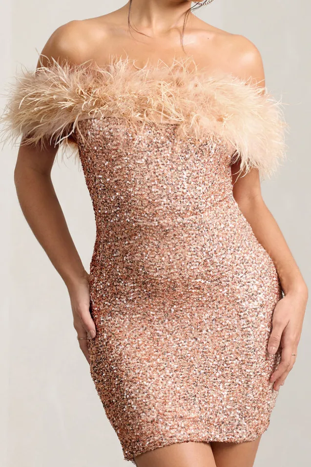 Be the first to review “New Money | Gold Bodycon Sequin Mini Dress With Feather Trim” Cancel reply