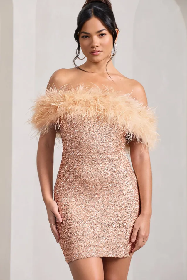 New Money | Gold Bodycon Sequin Mini Dress With Feather Trim