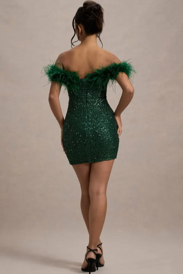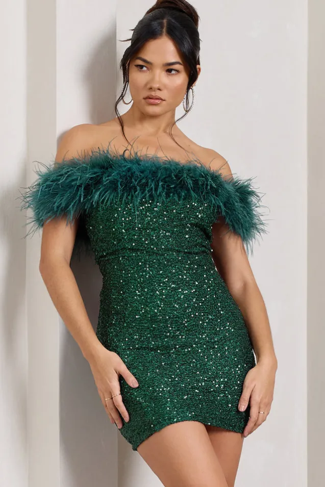 New Money | Green Bodycon Sequin Mini Dress With Feather Trim