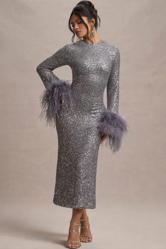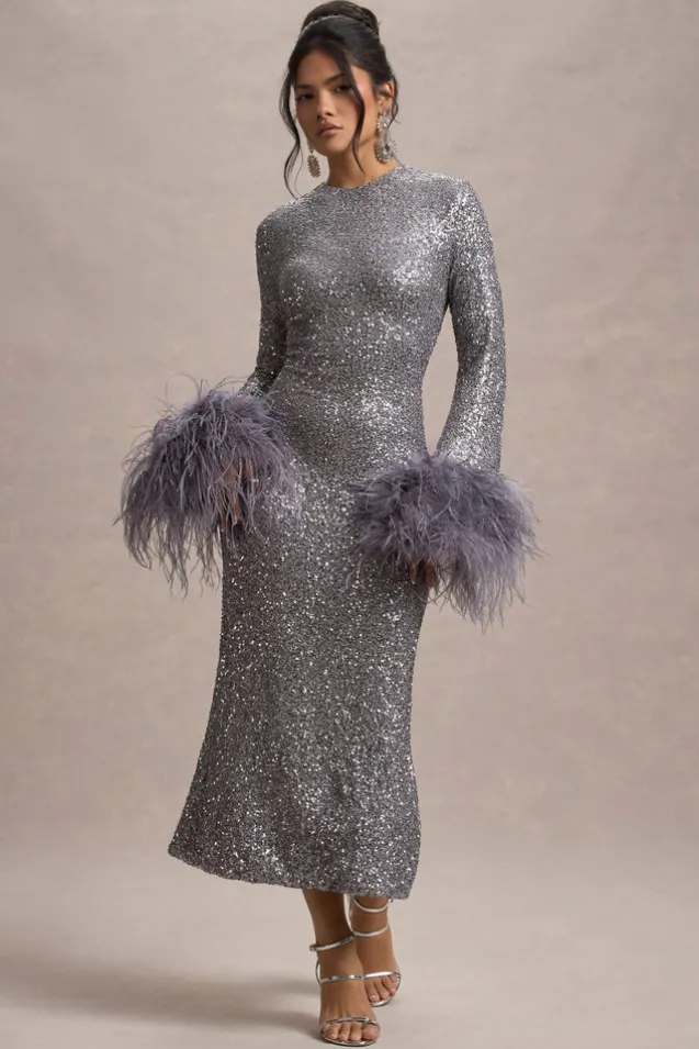 North Star | Silver Sequin Long-Sleeve Midi Dress With Feather Cuffs