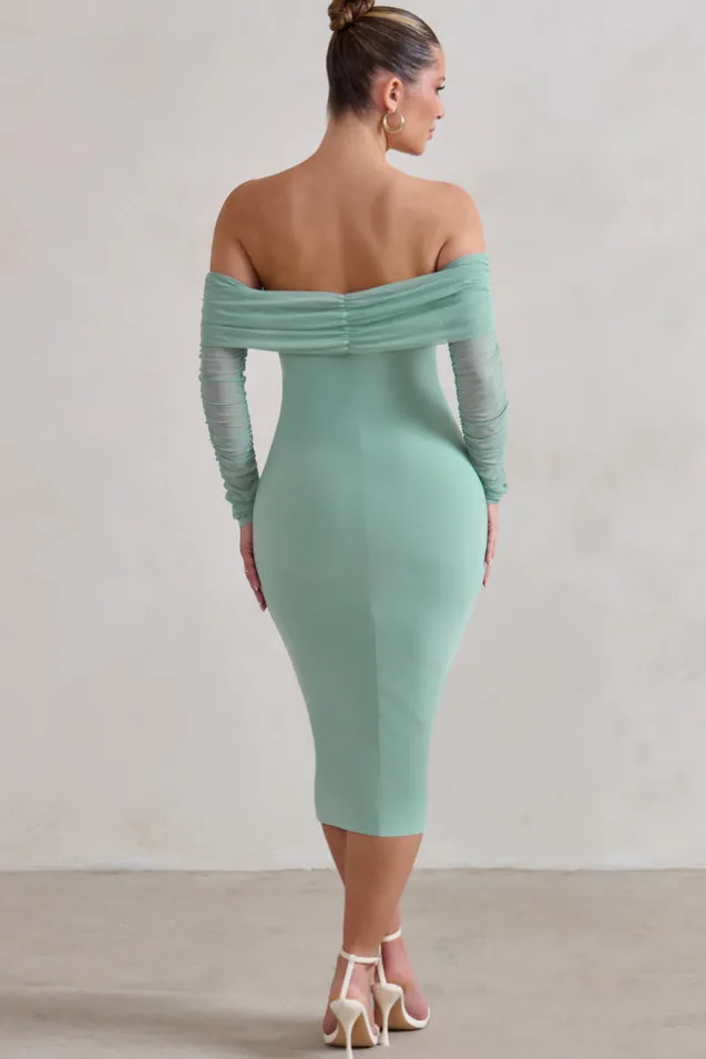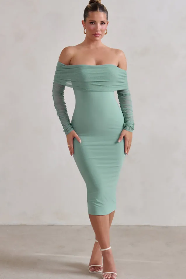 Only You | Sage Ruched Mesh Bardot Midi Dress