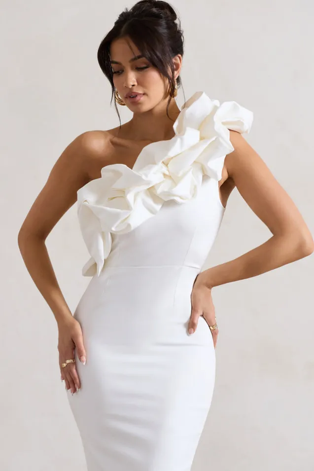 Orchestra | White One Shoulder Ruffled Midi Dress