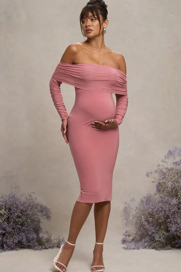 Patiently Waiting | Blush Pink Maternity Ruched Mesh Bardot Midi Dress